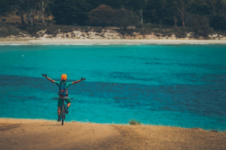 Mengendarai sepeda gunung, Maria Island National Park, Tasmania © Matt Staggs