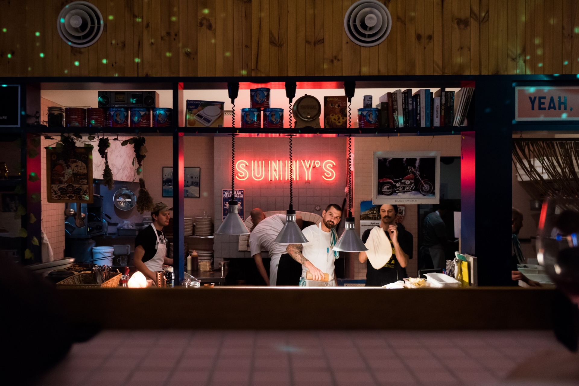 サニーズのメニューは「ピザ」と「ピザ以外」に分けられていて見やすいのですが、注文するものを決めるのは容易ではありません。ナポリ・スタイルのピザの特徴は生地が厚めであることと、音を立てて燃える薪オーブンで焼いた香ばしさです。スペシャルメニューは常に変わります。ピザ以外のメニューには、オーブンで焼いた芽キャベツやロブの有名なフライドチキンなどが載ったシェアプレートがあります。