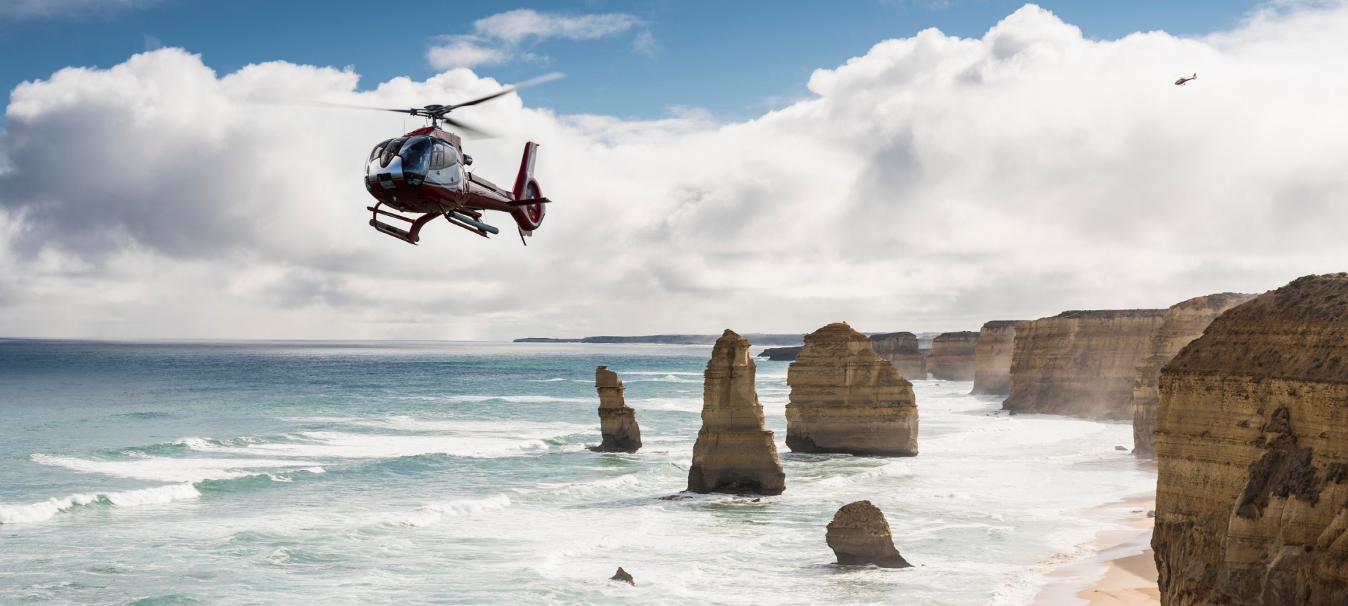 グレート・オーシャン・ロード は、冷涼な温帯雨林、有名なサーフ・ブレイク、ドラマチックな石灰岩の断崖が243kmにわたって続く、オーストラリア屈指のドライブ旅行に最適なスポットです。海上45m超もの高さにそびえる12使徒は、最も印象的な景色の一つと言えるでしょう。ベイ・オブ・アイランズ(Bay of Islands)をめぐる25分間の遊覧飛行で、上空から立ち並ぶ石灰岩や近隣の自然の見どころを満喫することができます。